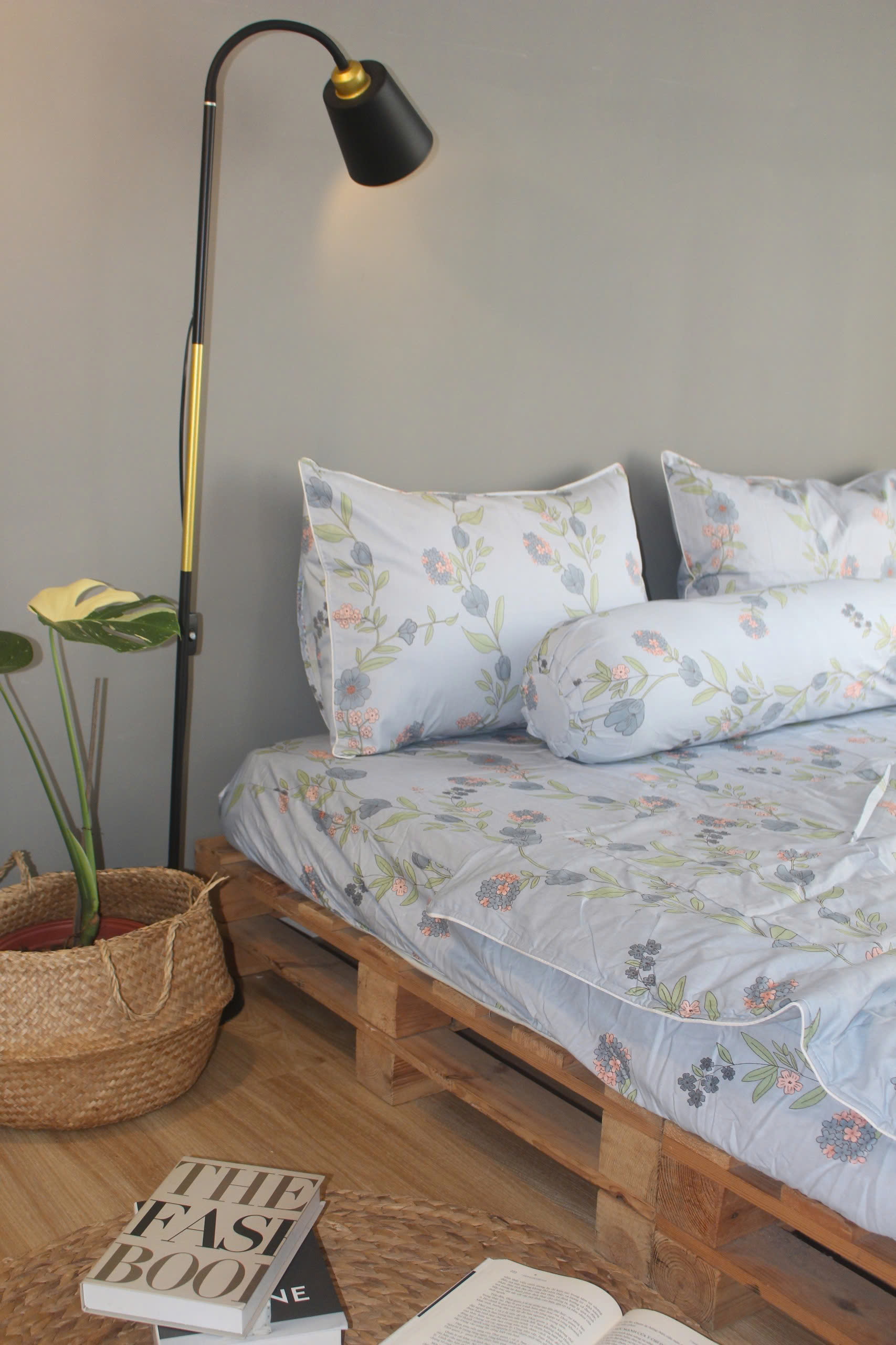 Bộ drap gối KHA LY - 100% cotton thiên nhiên Dây Leo-Xanh Xám